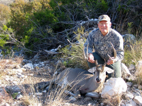 | We hunted Goldmine Canyon Ranch in eastern Val Verde County this year, a property owned by friends of ours. We had hunted this area a couple of times previously, but never for the entire season. We really didn't know what kind of deer to expect - the property to the north (deer reservoir) had recently been put under a high fence and the properties to the south were small and overhunted. However, in October, floods washed holes in the fence that were never repaired, and we continued to have good numbers of deer. Marla started things off with a doe, then an ancient toothless buck. The first weekend of December, Marla shot a 138" 8 point with stickers and a shot an older 10 point on the same afternoon. I ended the season with a 20" wide 129" 8 pt after Xmas. |