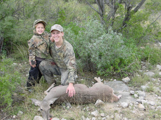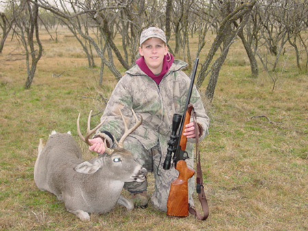 | Again saving for Africa, we mostly hunted public land in East Texas. We focused on Bannister WMA again, and saw deer both times we went, including at least one legal buck, but nothing we wanted to pull the trigger on. After Christmas, a friend of Dad's invited us to hunt a property that he owns in NW Val Verde County. The place had been a bit overhunted, but there were numerous young bucks. We figured that this would be a great opportunity for Cheyenne to take her first buck, and she dropped the hammer on this nice 3½ year old 8 point buck. Just as she fired, he put his antlers in the line of fire, and her shot broke the right main beam. I ended up putting a finisher in to anchor him and forestall a tracking job. |