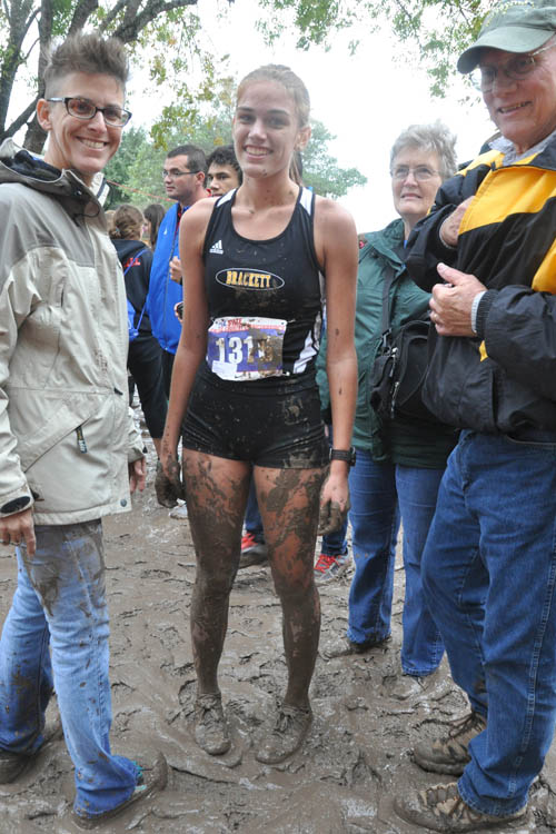 As soon as I approached the starting line I knew this would  be an…interesting race. Girls were coming out of the finish line covered in mud  and just the hill going up to the starting line was covered in soupy mud. I  began to warm up (after figuring out which box I was in by counting because the  numbers were also covered in mud) and I tried to stay out of the mud. I soon  decided this was pointless and didn’t worry about it anymore. Even though the  mud discouraged me I still wanted, at the very least, to finish in the Top 15  and achieve all state.