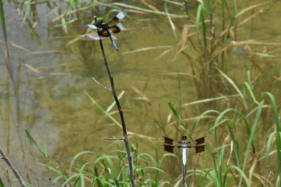 Twelve-spotted (Libellula pulchella) and Flame (Libellula saturata) Skimmer males